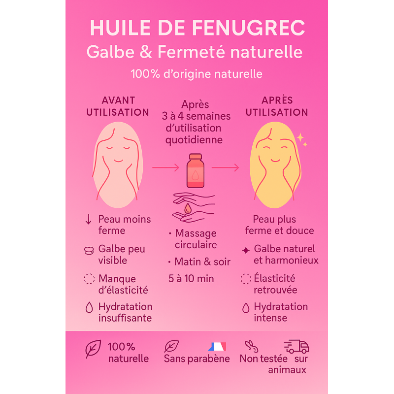 L’Huile de Fenugrec Tameem Paris est spécialement conçue pour les femmes désireuses de sublimer naturellement leur silhouette, en redonnant fermeté, tonicité et galbe à la poitrine et aux fessiers, tout en nourrissant profondément la peau.