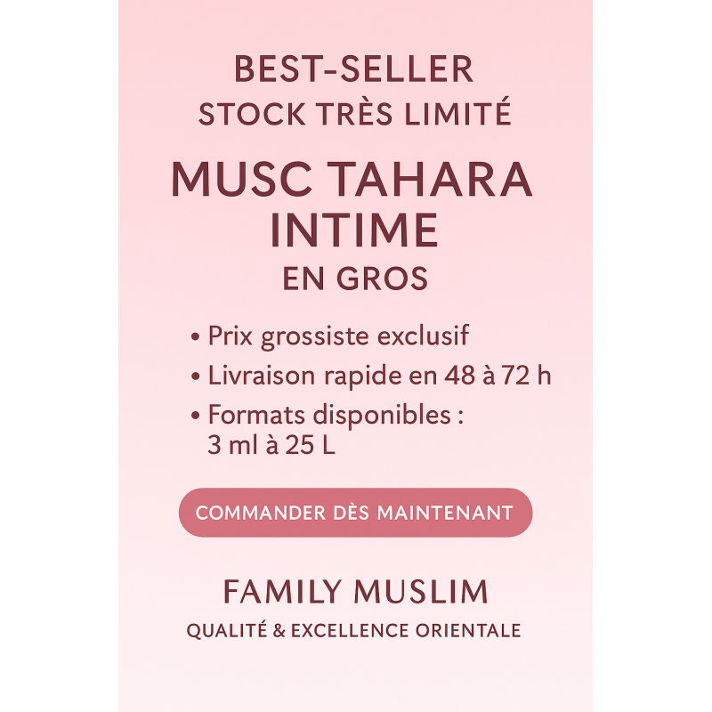 Notre engagement repose sur trois piliers : pureté, qualité et constance. Le Musc Tahara Intime en gros est le reflet de ces valeurs – un parfum de confiance, respectueux du corps et porteur d’élégance.